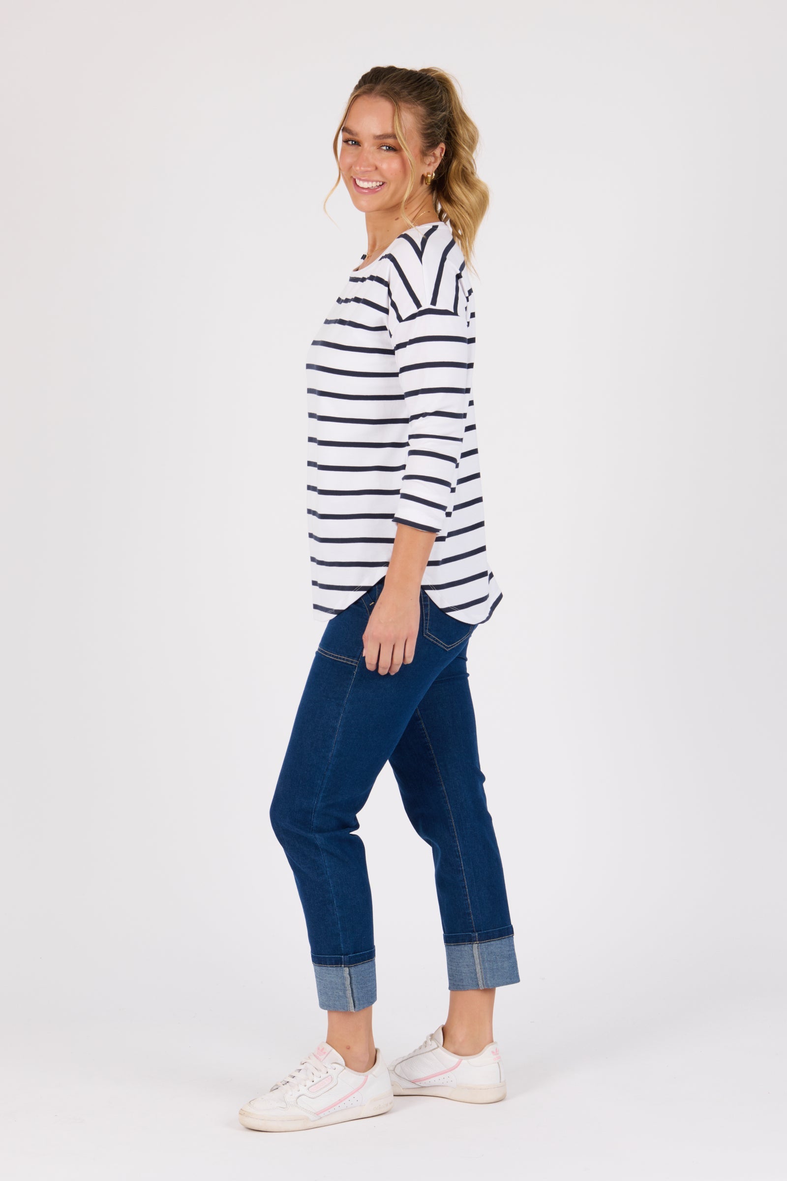 The One Ten Willow 3/4 Sleeve Scoop Hem Tee in White/Navy Stripe is your go-to essential for effortless everyday style. Crafted from a soft cotton-elastane jersey, this women’s striped top features a relaxed dropped shoulder, curved scoop hem and classic round neckline for a flattering, easy-to-wear fit. Designed in Geelong, Australia, it delivers breathable comfort and timeless versatility — perfect for jeans, shorts or layering year-round.
