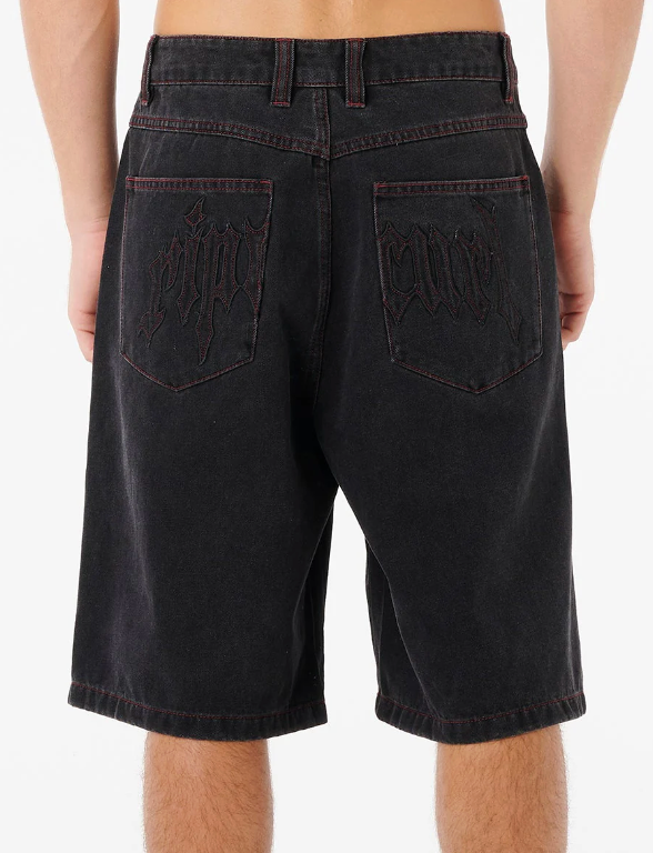 The Rip Curl Archive Goth Denim Walk Short brings street-ready style with a relaxed, baggy fit. Crafted from 10oz cotton denim, it features self-fabric appliqué, metal logo trims, and contrast stitching for an elevated finish. With a longer 23" outseam, these washed-black walkshorts deliver that laid-back, oversized look perfect for everyday wear.