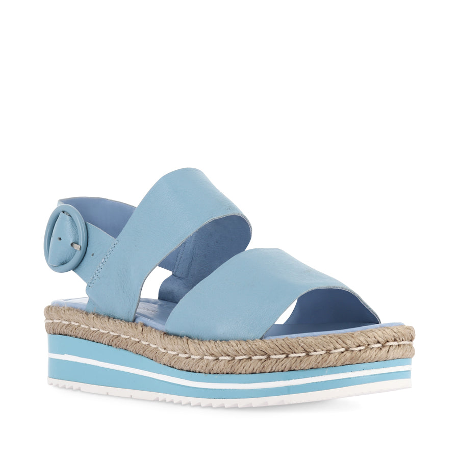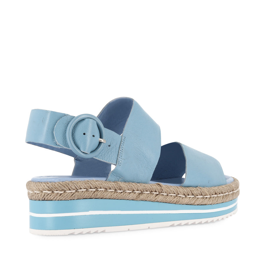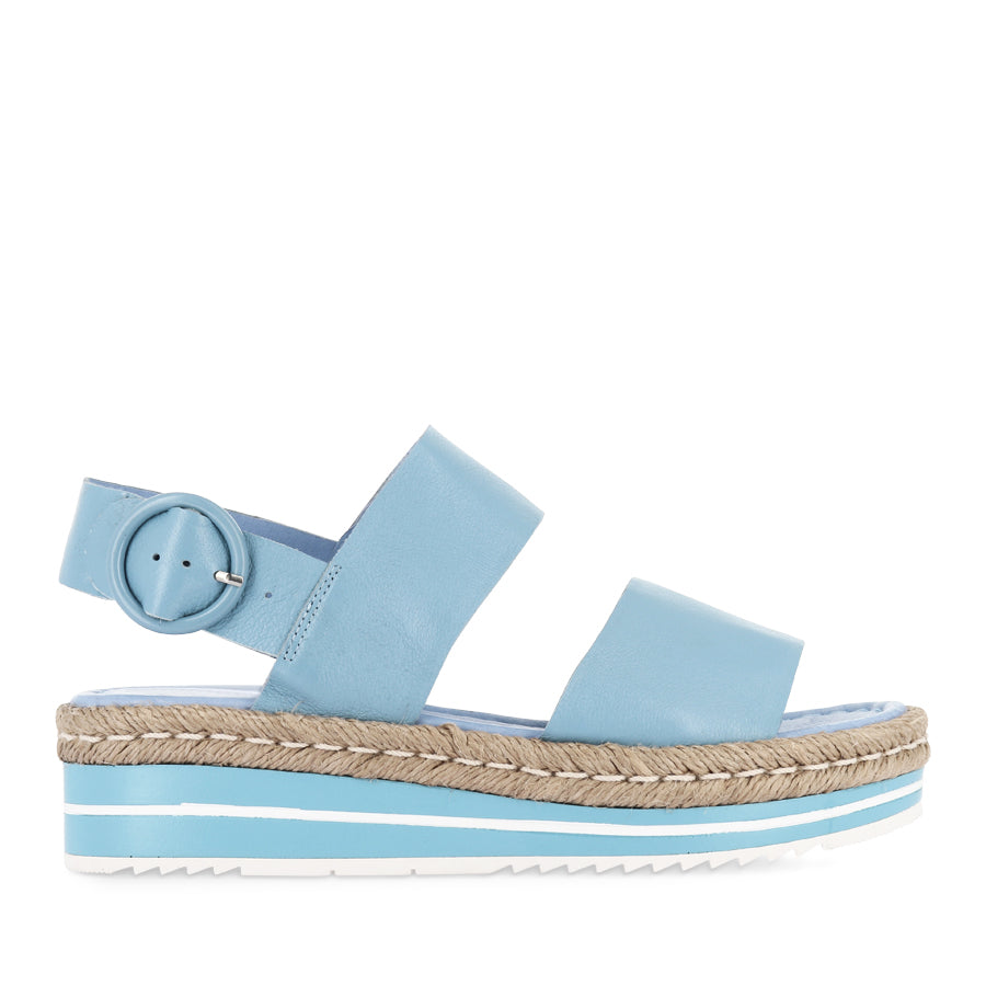The ATHA – New Blue Leather by Django & Juliette brings summer into every step with stylish womens platform sandals featuring a secure slingback strap with adjustable buckle, double forefoot straps, open round toe and open heel counter for breathability, and a layered platform sole with jute rope trim that adds natural beach‑inspired detail; crafted with leather upper and lining and a comfortable 4.5 cm heel, these versatile sandals are perfect for warm‑weather wardrobes, casual day outfits, seaside strolls or dressing up sunny looks with effortless flair.