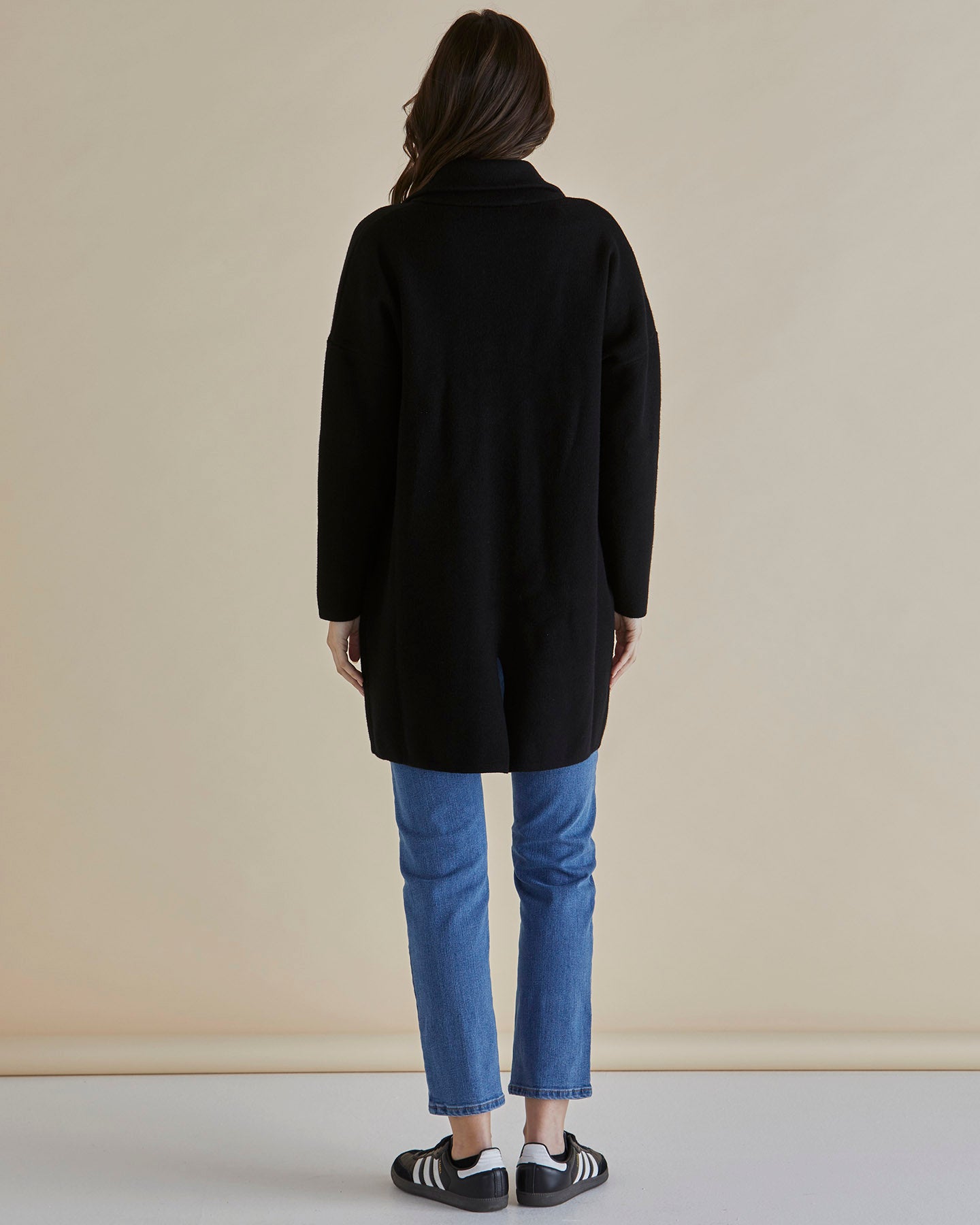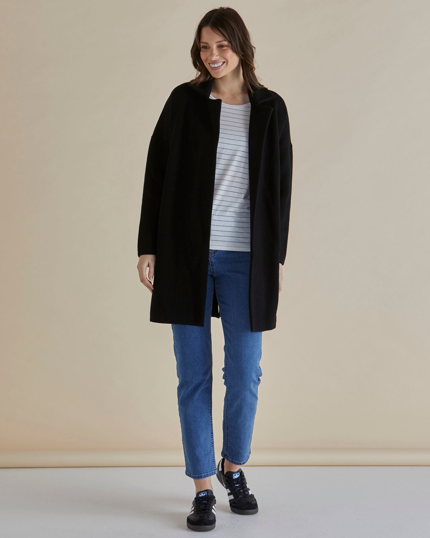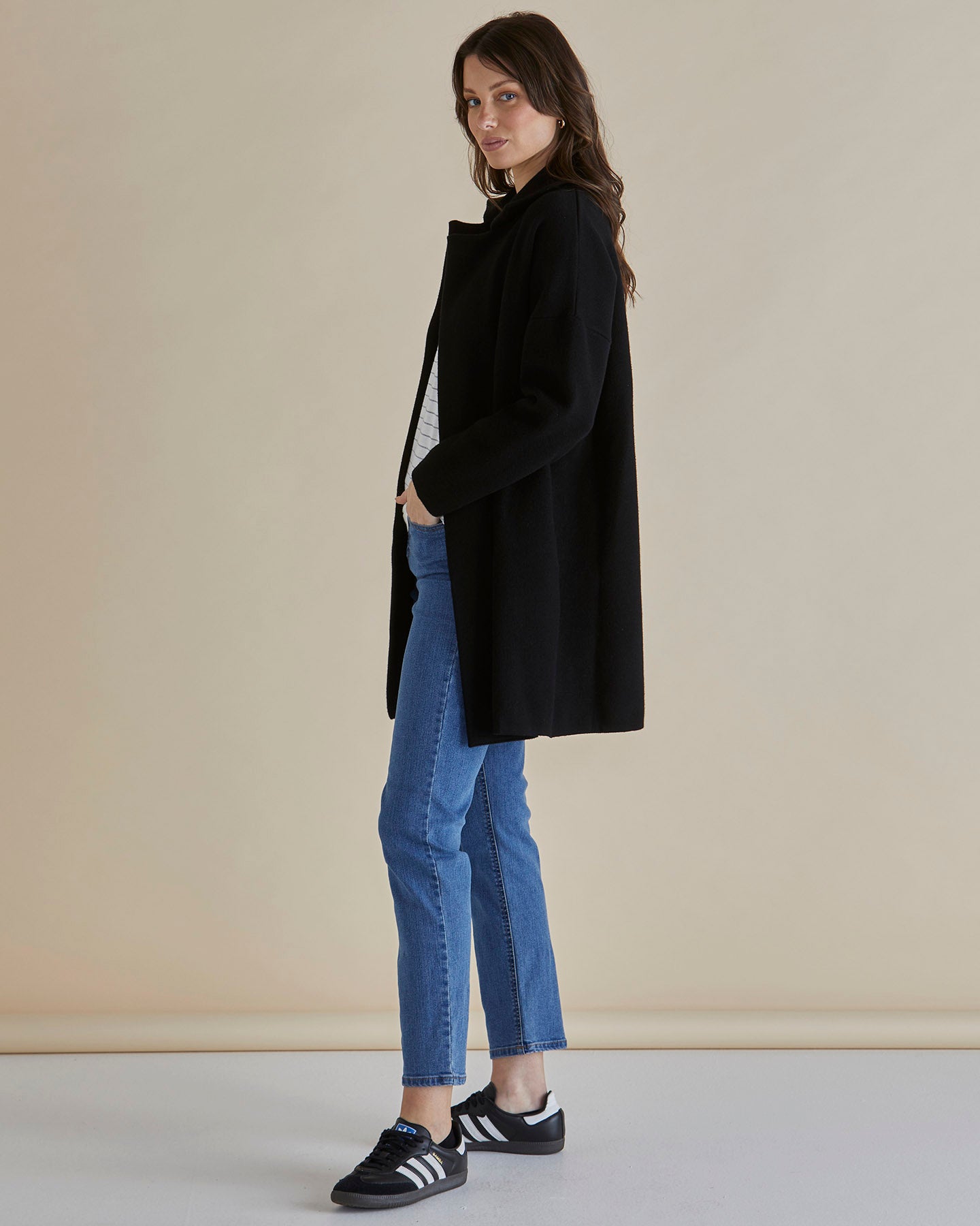 The Bristol Coatigan in black is the perfect fusion of coat and cardigan, combining style with all-day comfort. Crafted from a mid-heavy weight knit blend of viscose, nylon, and polyester, it features a relaxed fit with a classic collar, lapels, and side seam pockets. Designed with a flattering back vent, this longline coatigan is an effortlessly chic layer for cooler months.