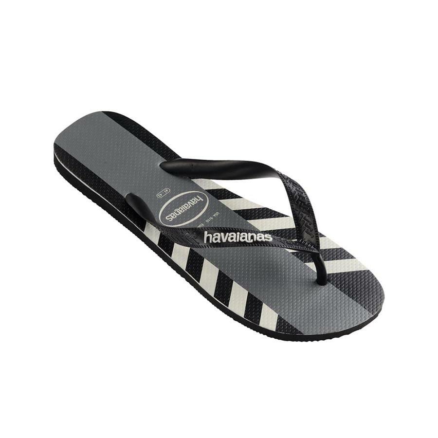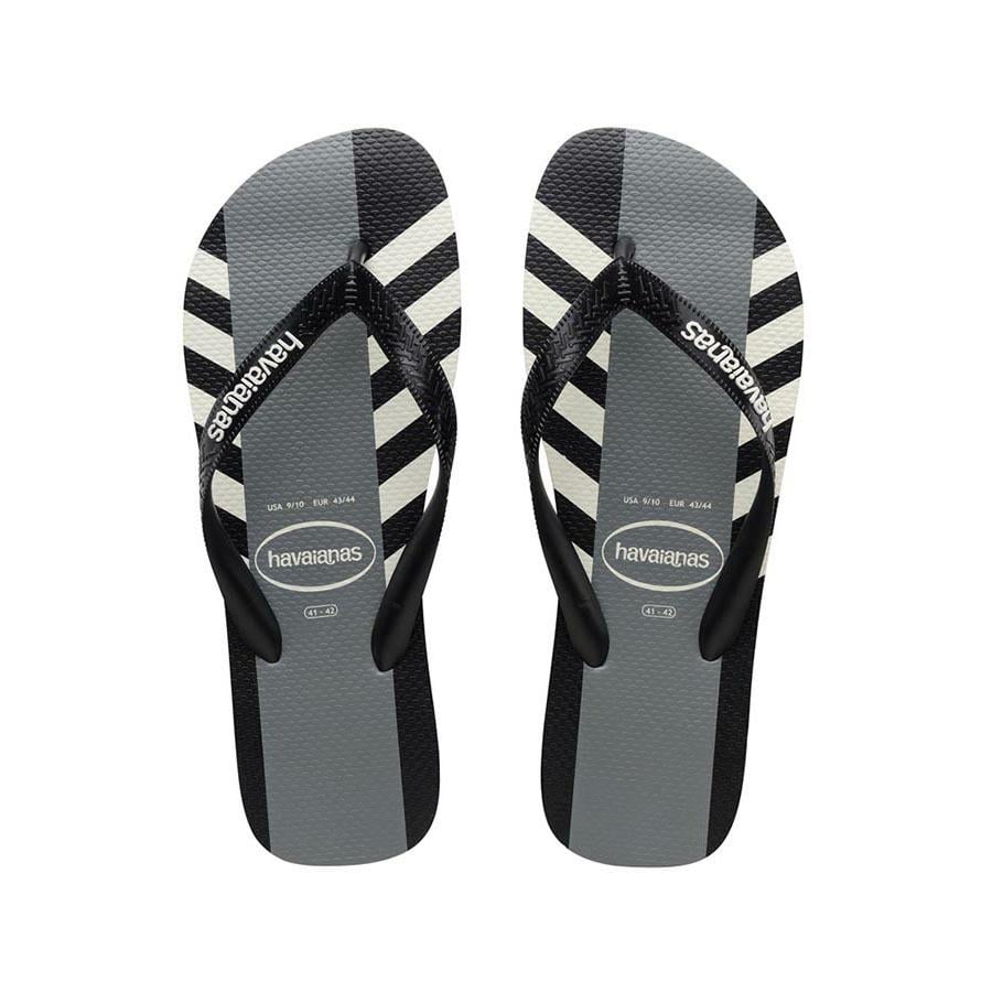 Walk a fine line this summer with the Havaianas Top Lines Black Thongs. Featuring a bold line-inspired print across the sole in grey, black, and white, this pair blends classic style with modern edge. Finished with top black straps and a crisp contrasting white rubber logo, they’re the perfect choice for everyday wear with a trendy twist.