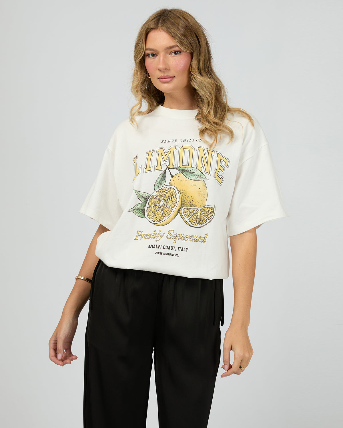 The Limone Tee in vintage white brings Italian summer vibes to your everyday look. Made from 100% cotton, this oversized relaxed-fit tee features a bold lemon graphic across the front for a fresh seasonal touch. With a classic crew neckline and short sleeves, it’s the perfect easy-to-wear piece for pairing with denim, skirts, or linen pants.