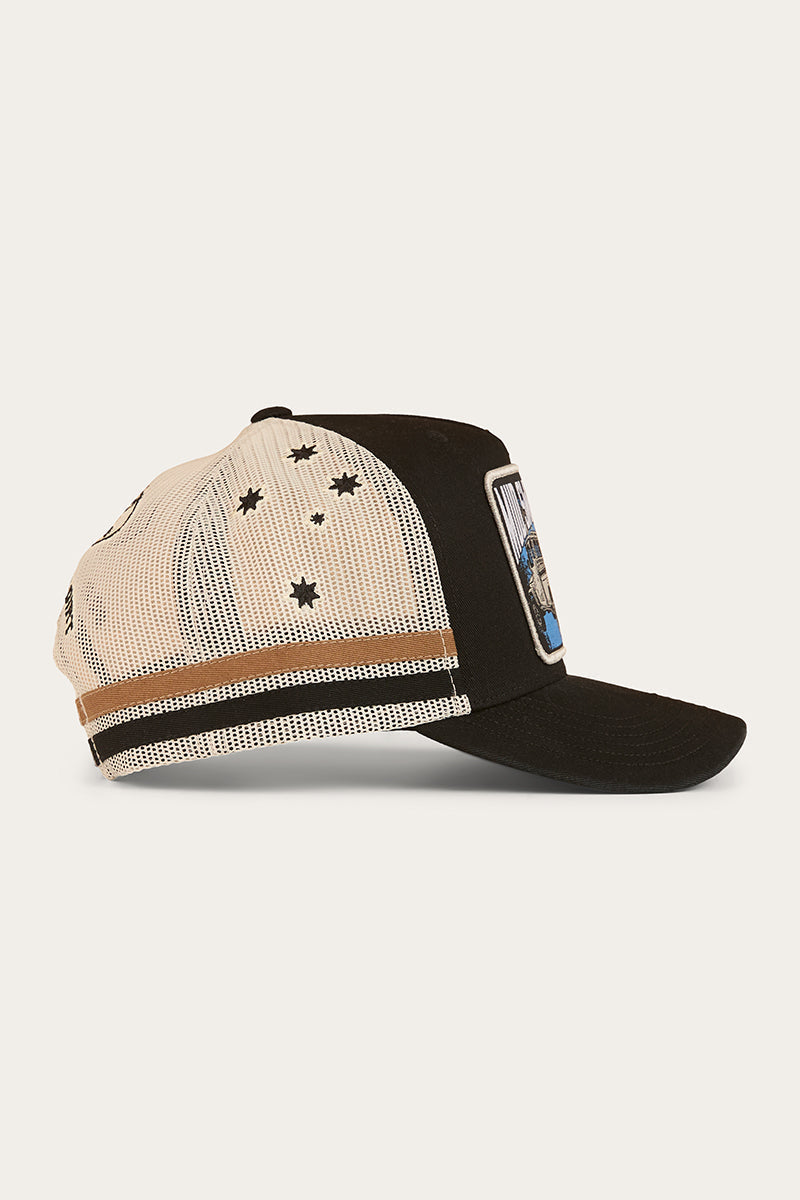 The Ringers Western Mud Sweat Beers Trucker Cap is built for long, sunny days, knock-off drinks, and all-round Aussie mischief. Designed with a deep, comfortable fit, this men's trucker hat features a durable cotton twill front, breathable mesh back panels, and a curved peak showing an Australian flag with rugged frayed edging. A classic ute-badge woven patch and branded detailing complete the look.