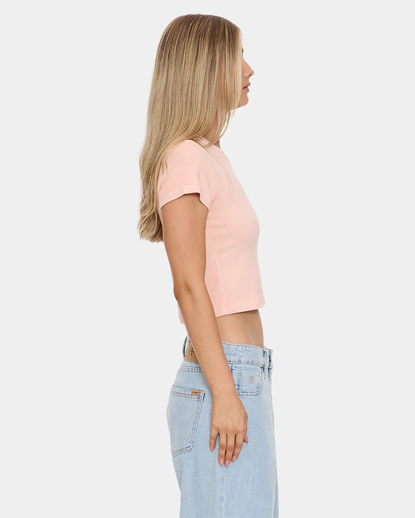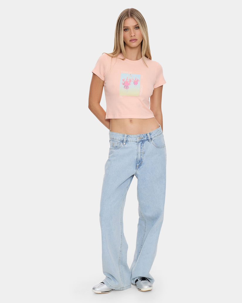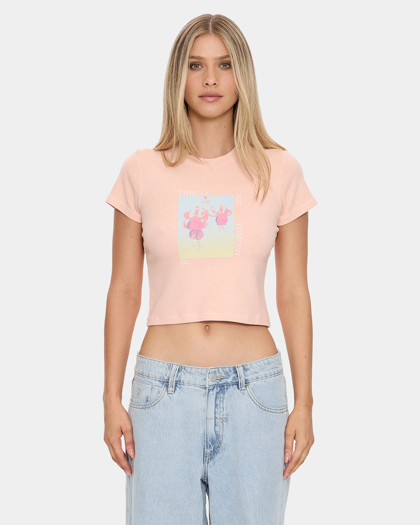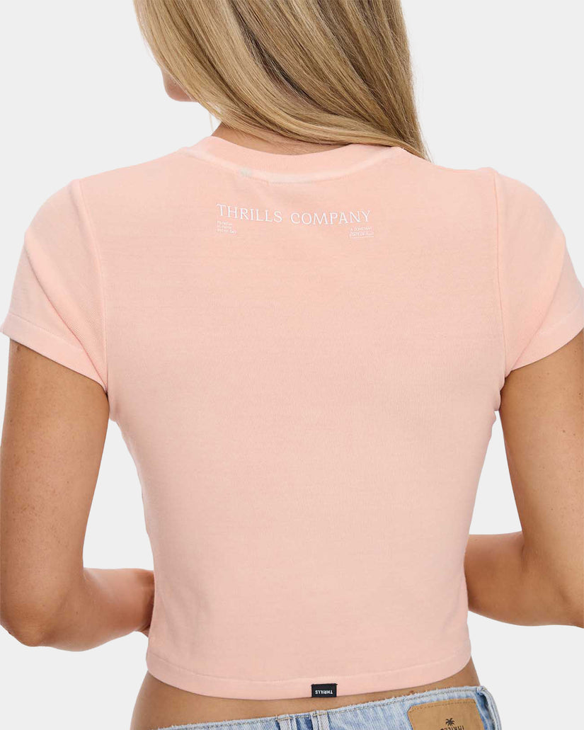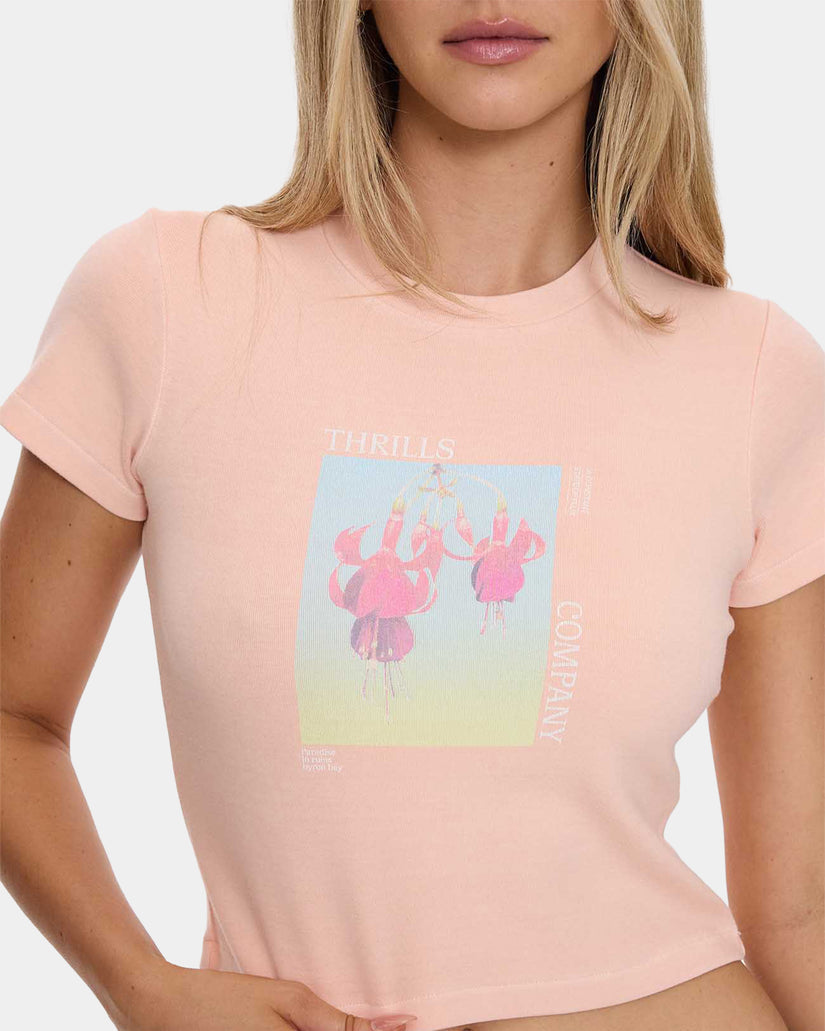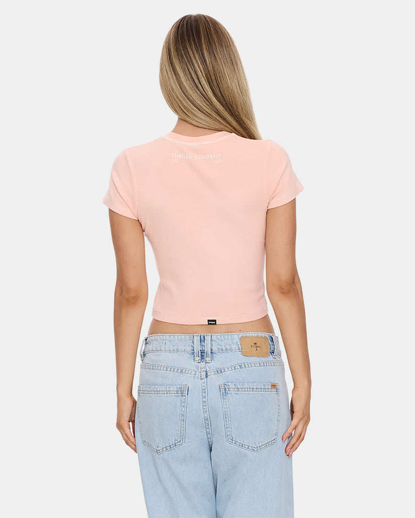 The Thrills Nature Of Illusion Mini T-Shirt delivers a fresh, modern twist on an everyday essential. Designed with a fitted mini-tee silhouette, it features short sleeves, a classic crew neckline, and a bold front graphic for standout style. Made from soft cotton jersey, it’s the perfect go-to for pairing with denim, cargos, or skirts for effortless streetwear appeal.